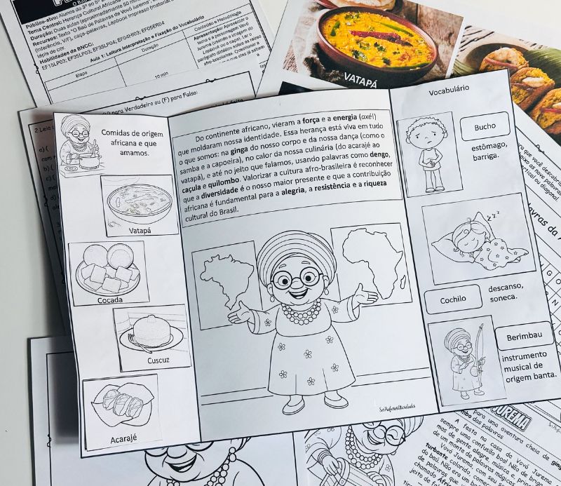 - Lapbook Interativo: Arquivo completo para montagem, para fixar conteúdos de vocabulário e culinária africana.