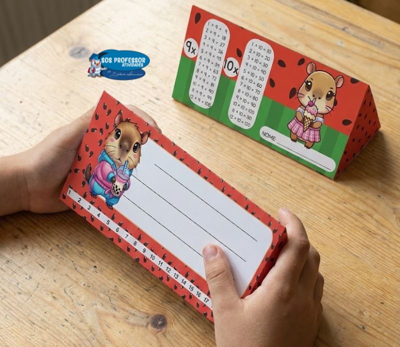 Crachás de mesa com tabuada e alfabeto (editáveis no Canva)